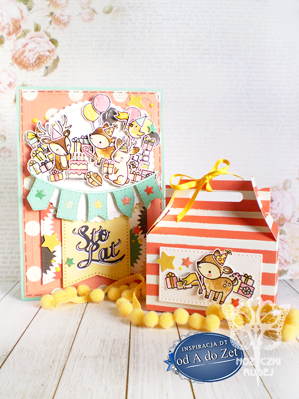 Ja w swojej kolekcji mam ich już trochę, a to za sprawą przepięknych napisów, które urzekły mnie swą czcionką i tym, jak bardzo są one uniwersalne. Dzisiaj w roli głównej występuje wykrojnik "Sto Lat!", choć równie ciekawie odnalazłby się tutaj wykrojnik "Moc życzeń", czy wykrojnik "Dla Ciebie". Słodkie zwierzątka od Lawn Fawn pokolorowałam za pomocą mini wersji tuszy Distress i średniej wielkości pędzelka wodnego. Blasku całości nadały żółte perełki w płynie Nuvo w kolorze "Dandelion Yellow " i preparat "Glossy Accents" dostępne w dwóch pojemnościach. Ja póki co bawię się mniejszym, ale tak mi się podoba ów efekt, że następnym razem na pewno zainwestuję w większą buteleczkę.