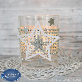 Do dekoracji użyłam gwiazdek wyciętych w srebrnym i perłowym kartonie, które ułożyłam w zgrabną kompozycję. Niektóre gwiazdki przyklejałam na taśmę dwustronnie klejącą, a niektóre (mała gwiazdka naklejona na środku tej dużej, ażurowej) nakleiłam na kostkę dystansową, żeby kompozycja nie była taka płaska.
